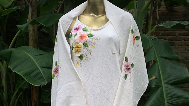 Edna Jaugueri dyes cotton, then appliques and embroideries it into floral designs on clothing.
