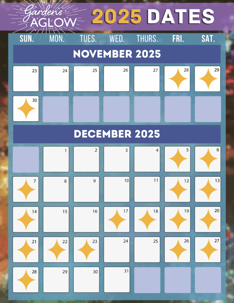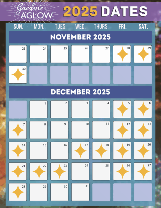 Gardens Aglow will take place on selected dates in November and December 2026. The schedule will be posted here and at Friends of the Garden, which hosts this annual holiday tradition.