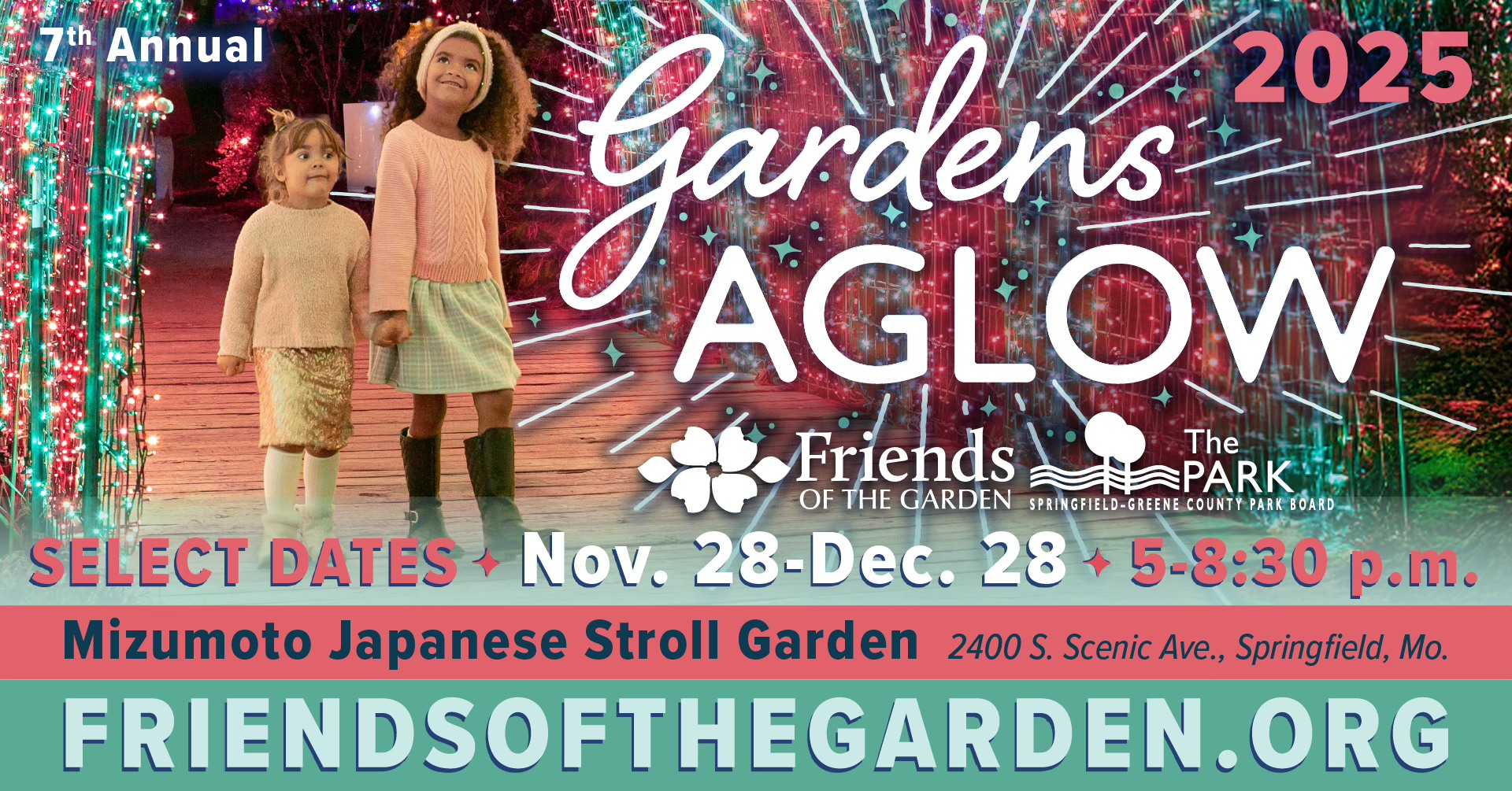 Friends of the Garden donates half of the Gardens Aglow admission proceeds to the maintenance fund for the Mizumoto Japanese Stroll Garden, sponsored by Simmons Bank. The remaining admission proceeds further Friends of the Garden’s mission to support the Springfield Botanical Gardens.